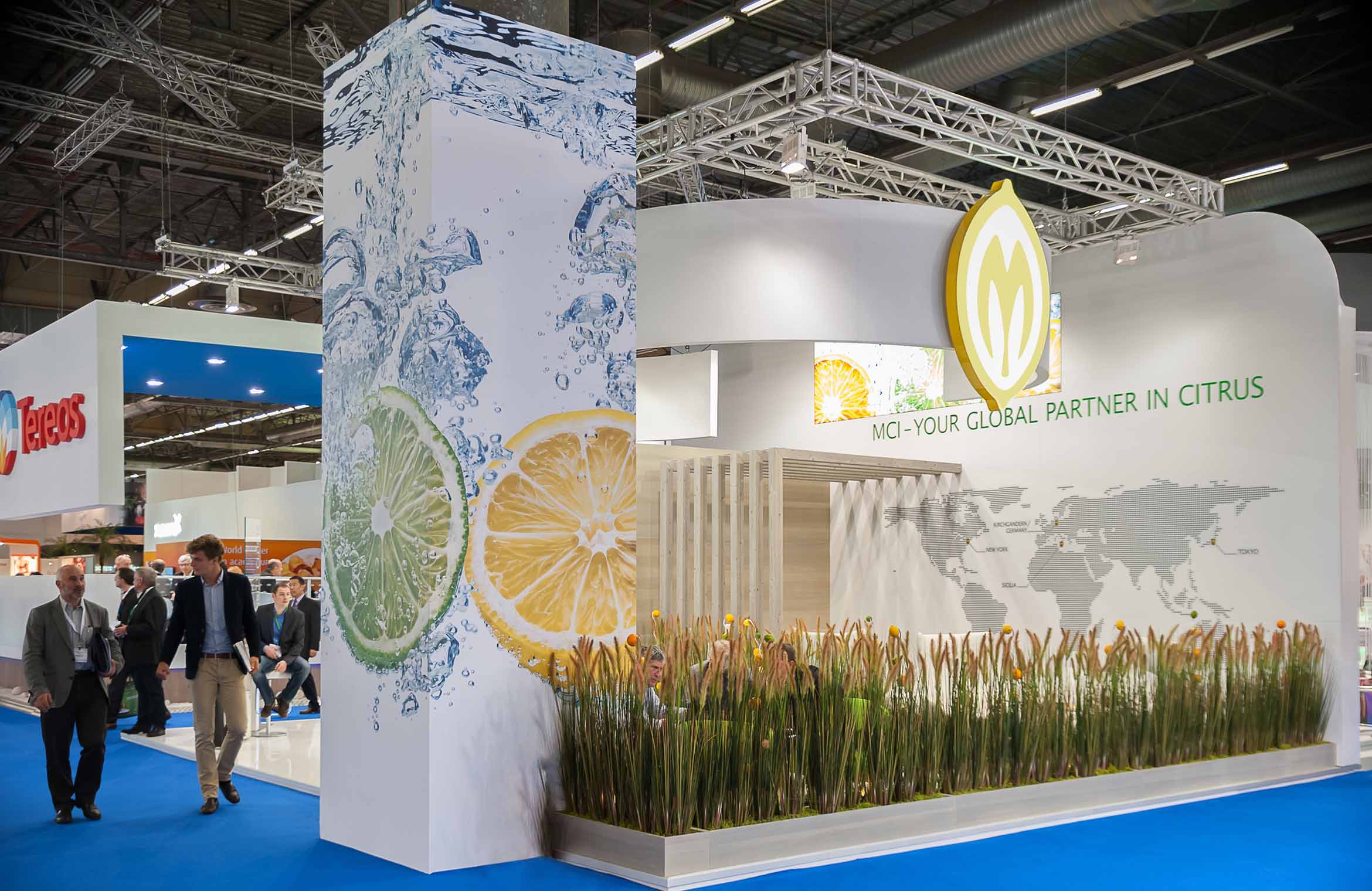 Die FIE-Messe (Food Ingredients Europe) ist der Treffpunkt für Hersteller von Lebensmittelinhalts- und Zusatzstoffen. Da unser langjähriger Kunde MCI Miritz als führender Produzent von Zitrusaromen hier schon einen gewissen Status hat, war die Präsentation des Produktportfolios eine echte Herausforderung. Denn die Produkte der Firma sind eher für die Nase als für das Auge gedacht, aber genau das will bei einem Messestand ja etwas zu sehen bekommen.